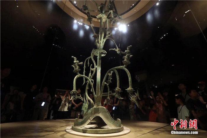 三星堆青铜神树,也被不少学者解读为古蜀东说念主思象中的“通天之树”。树上的神鸟、龙形等元素,共同组成一个象征天地疏导的天舆图景。