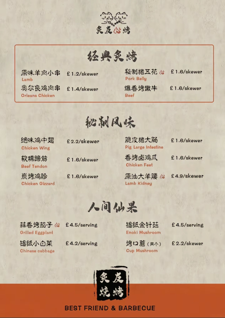 2025年的一张菜单清晰,烧烤摊有羊肉小串、猪五花、鸡肉串、翅中、茄子、小白菜等菜品,米兰体育价钱隔离为1.2英镑(约合东说念主民币11元)、1.6英镑(约合东说念主民币14.6元)、1.4英镑(约合东说念主民币12.8元)、2.2英镑(约合东说念主民币20元)、4.5英镑(约合东说念主民币41元)、4.2英镑(约合东说念主民币38.4元)。