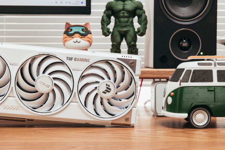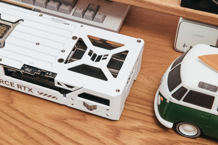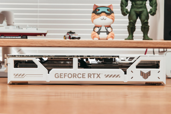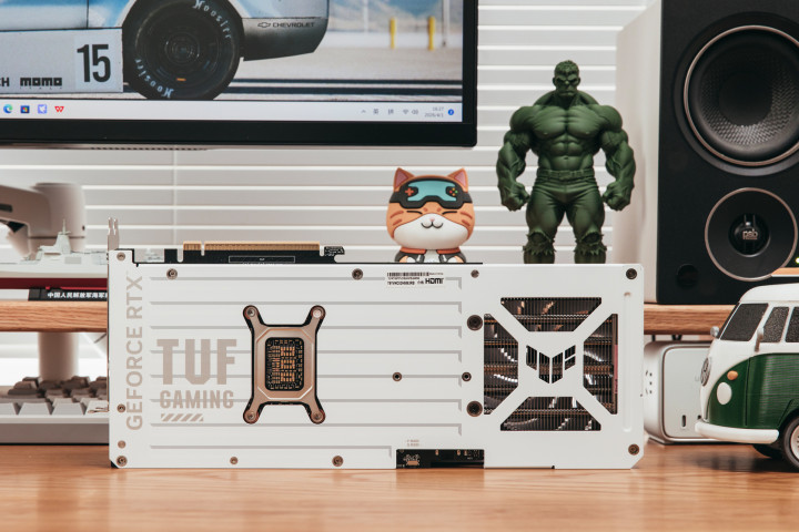 一整张简白皙色金属背板,筹办元素不算许多,左侧为TUF GAMING字样,右侧显卡尾部作念了规章镂空穿透筹办,中间为TUF logo。