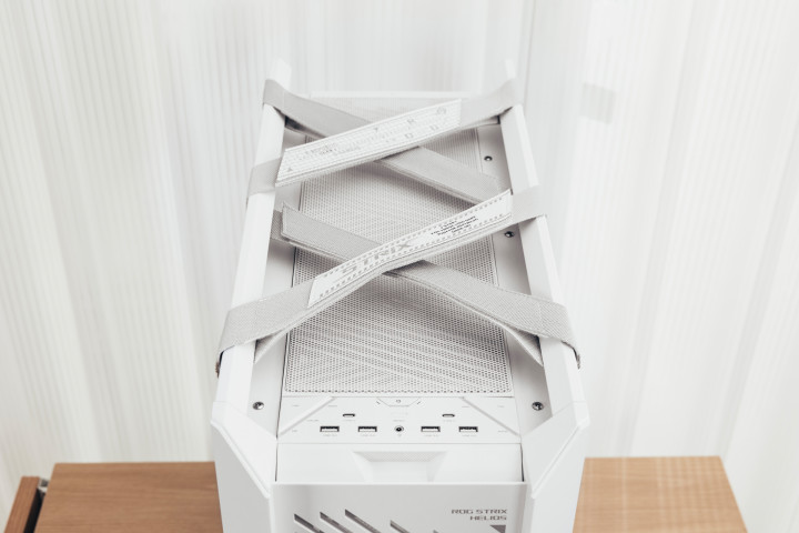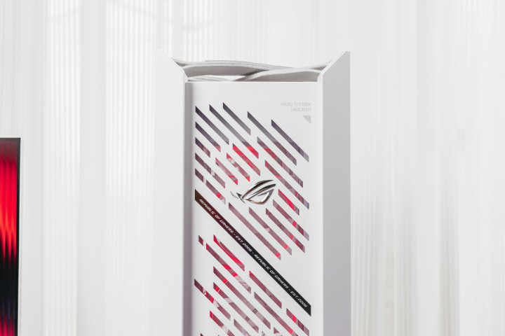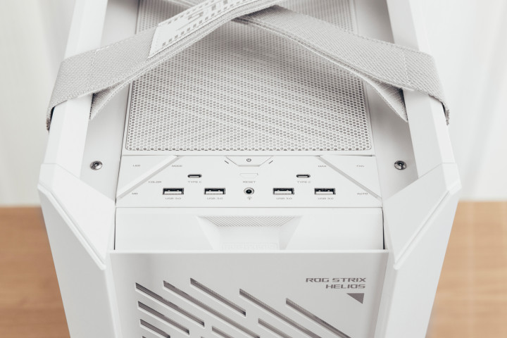 机箱来自华硕的ROG Strix Helios II太阳神焕新版,这个版块机箱的最大变化,是前部位置加多了更多进气位置,原先ARGB LED 灯板切换为能更有用吩咐当代硬件发热的铝合金透风面板,延续了原版的铝合金外骨架与支配双快拆侧透面板的结构。