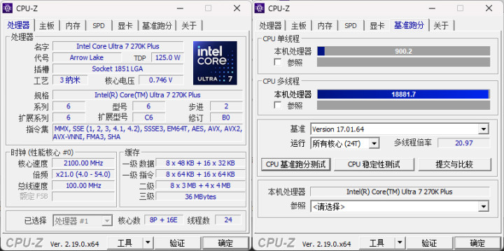 CPU-Z验明正身,这颗270K PLUS跑出了单线程900.2,多线程18881.7的获利,对比265K的单线程895,多线程15816的获利栽培止境夸张,多线程栽培了苟简20%支配的性能,接近Ultra9 285k的获利。