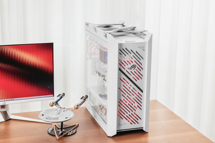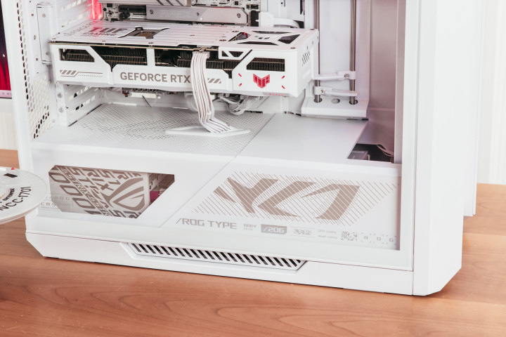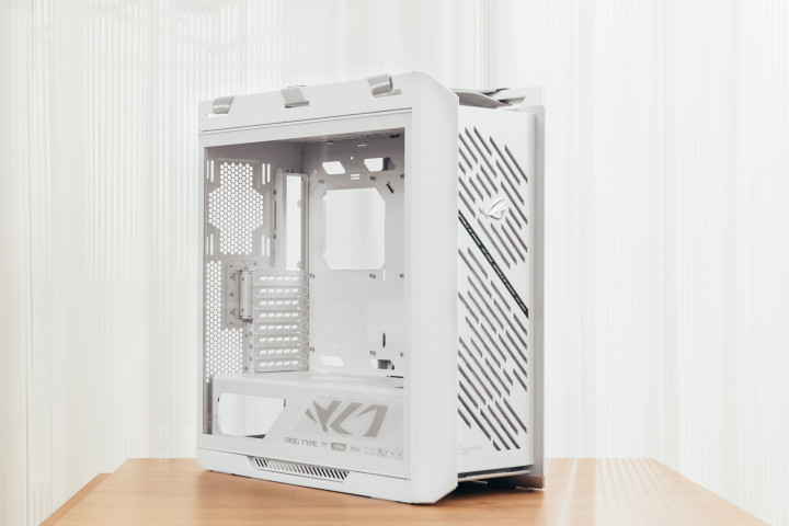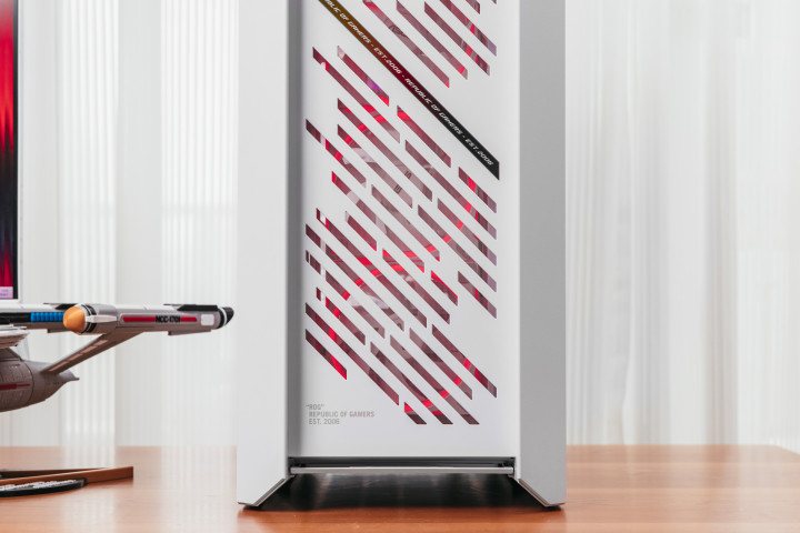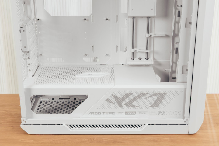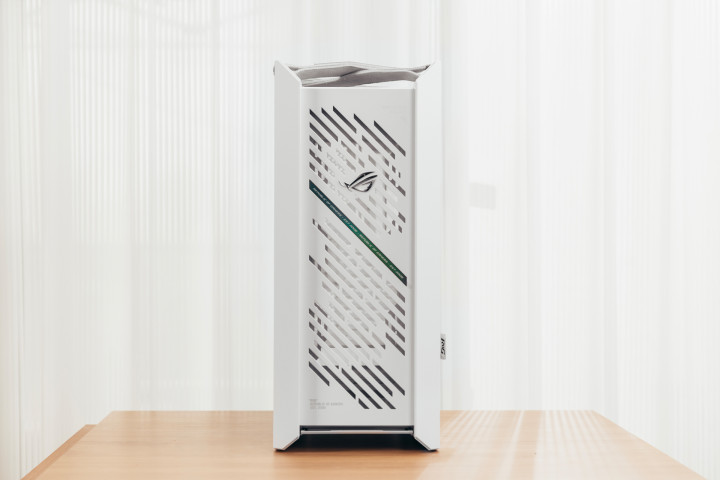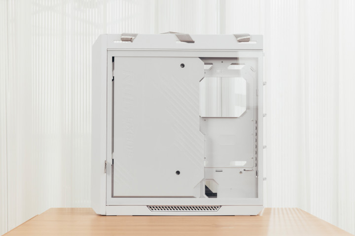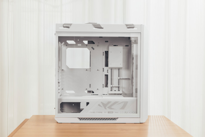 侧面一览,举座为高透钢化玻璃,底部电源仓有镂空,搭配ROG雷鹰系列电源视觉成果很好,另外关连元素亦然领略可见。