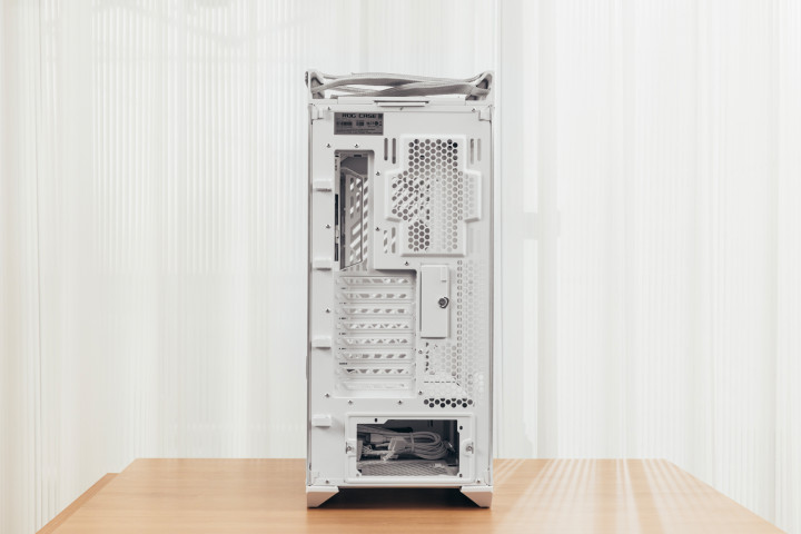 背部一览,标准的电源下置结构,PCIe挡板提供了8个,优化了PCIe快拆锁扣,另外显卡也可以竖装,延长线需要我地契独购入。