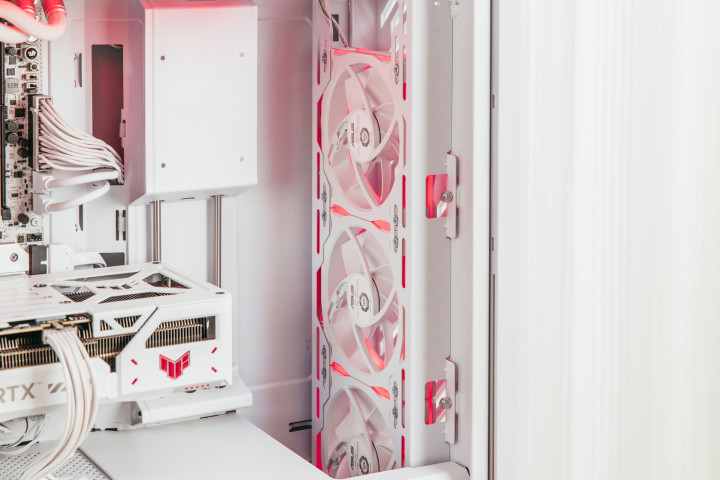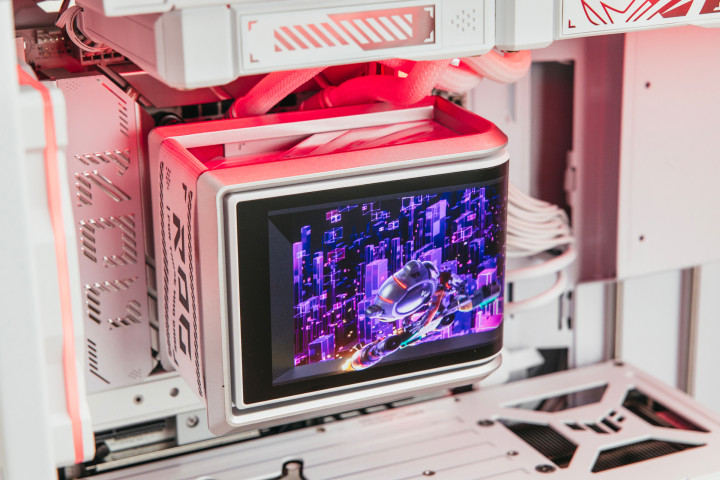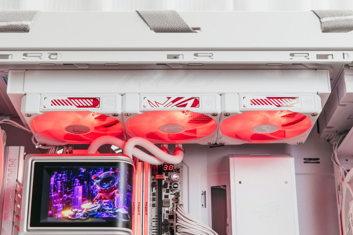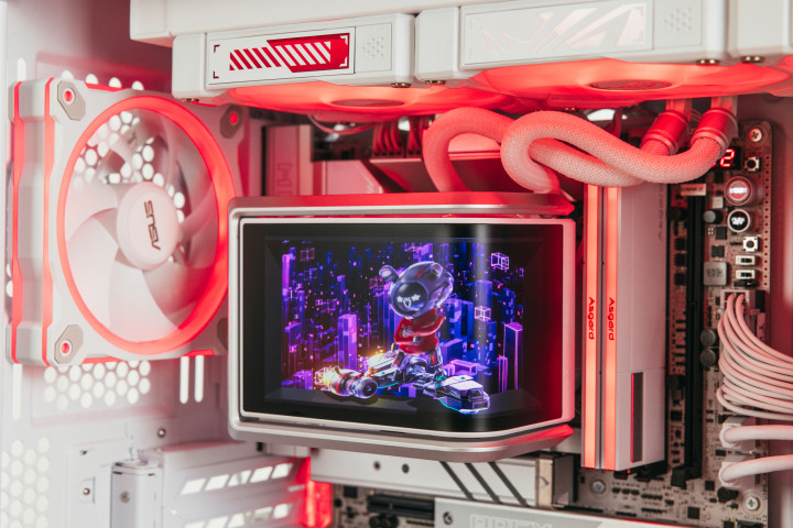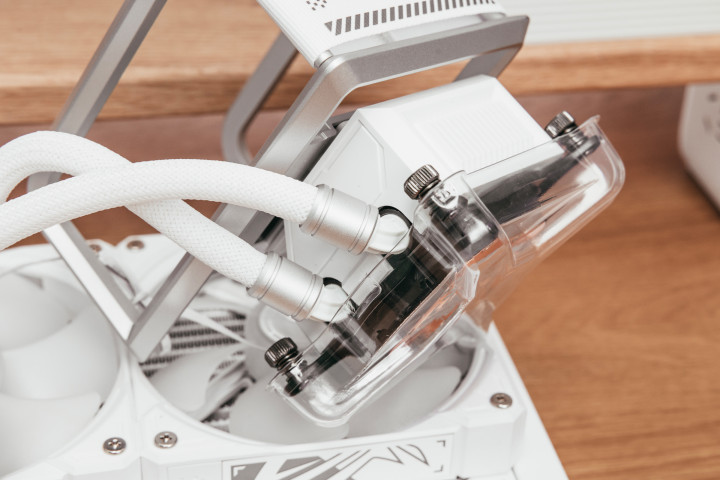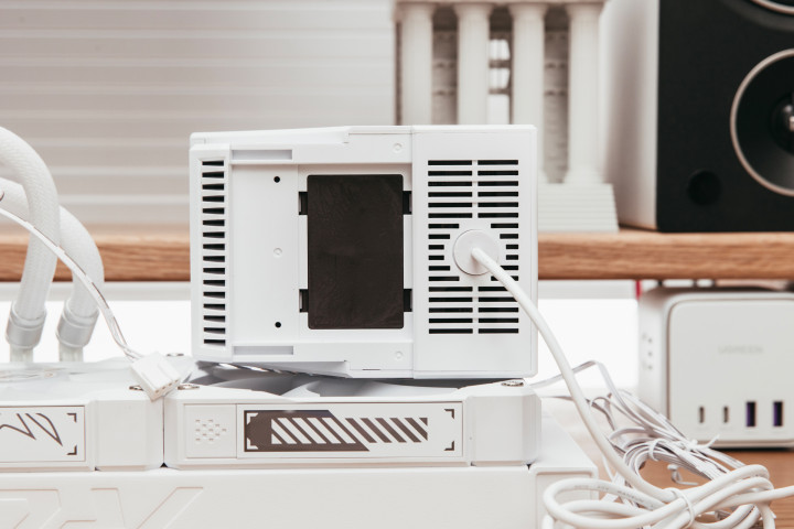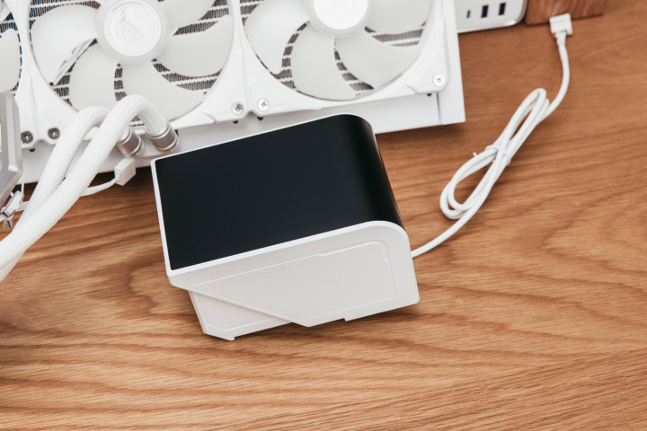电扇径直作念了预安设,省去了安设的终止,冷头屏幕为曲面屏,且是磁吸筹办,同期还能看到冷排电扇并莫得线材,电扇筹办了菊花链兼并,只需要一根磁吸线就可以适度。