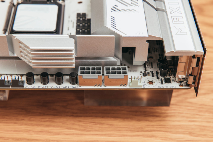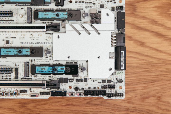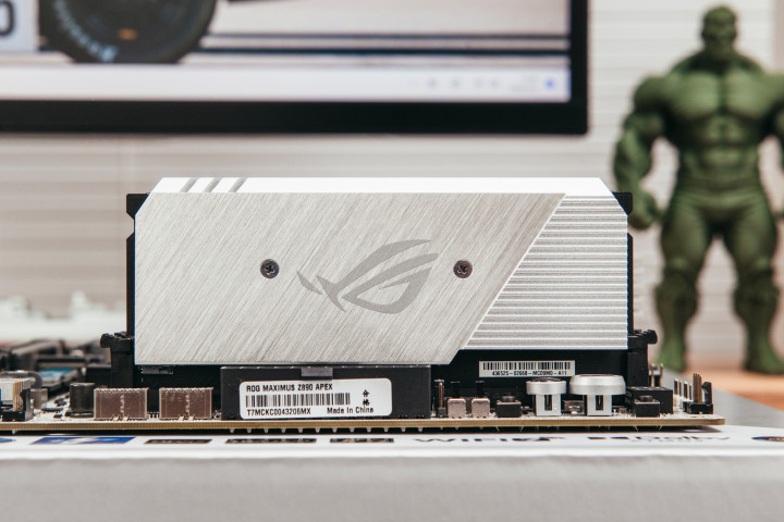 ROG Z890 APEX主板I/O+VRM散热装甲特写。