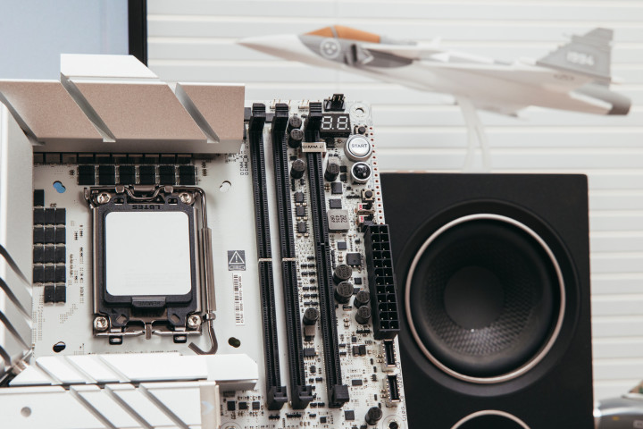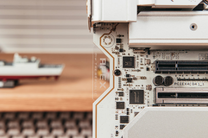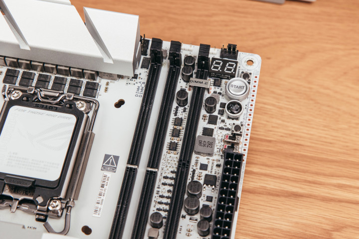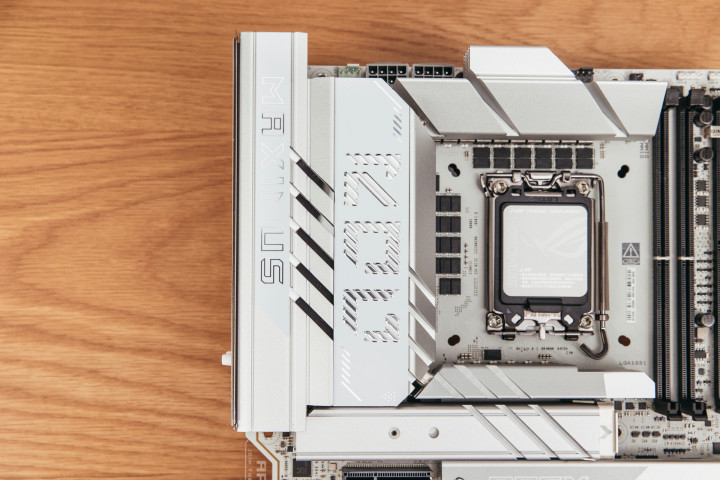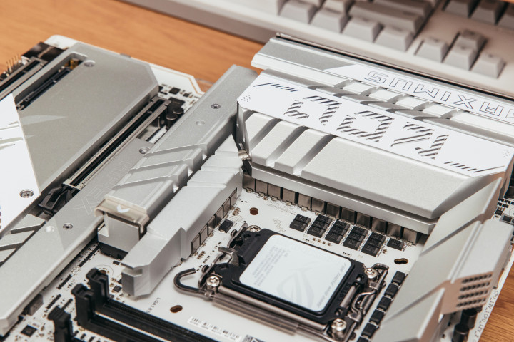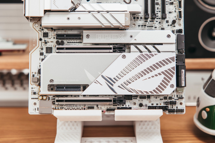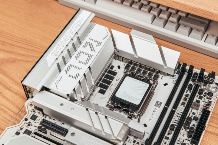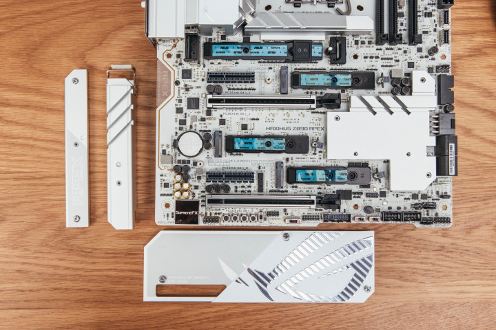 ROG MAXIMUS Z890 APEX为全白PCB板,搭配了银白色装甲,质感完全,全身仅少许接口为玄色,背部为大面积灰色搭配少许白色,ROG和败家之眼元素止境显眼,APEX字样也秀美了这块主板的身份。