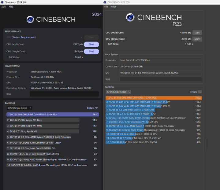 CinebenchR23和2024跑分,其中R23单核2392pts,多核42802pts,对比265K单核2333pts,多核35987pts,多核栽培昭彰。