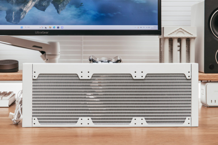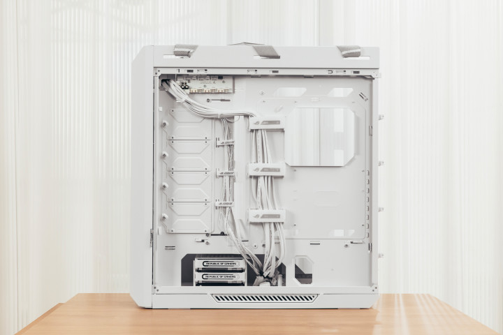 侧面视角一览,里面空间盈余较多,毕竟是奔着5090旗舰成立去的,下部原先电源位置镂空,有着可以的不雅赏性。