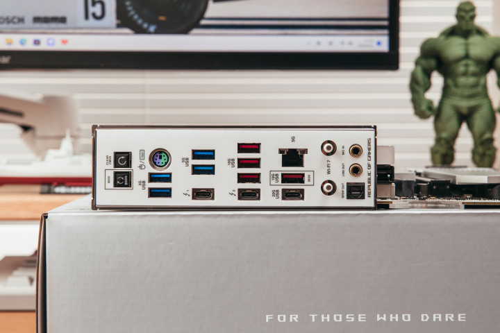 接口方面最显眼的是双雷电4接口,另外还提供了一个20Gbps USB-C口,4个10Gbps USB-A口,4个5Gbps USB-A口,网线接口为5Gbps, Clear CMOS和BIOS Flashback按钮均具备,WiFi7接口、数字音频接口以及键鼠PS/2接口一应俱全。