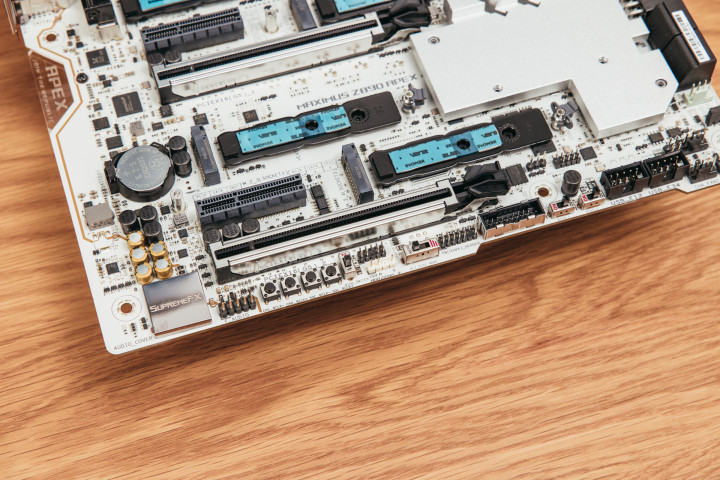 内存插槽右侧为华硕独家的DIMM.2插槽,通过彭胀卡可以达成两条PCIe 4.0 x4 M.2 SSD的彭胀,这样主板一共提供6个M.2插槽。