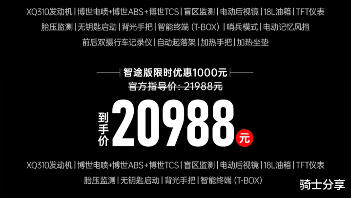 与此同期,该车还会有教育款XQ310发动机为其兜底,并有18升大容量油箱来为资料摩旅添砖加瓦,更有低坐高、长轴距车身来确保骑行泄气性。