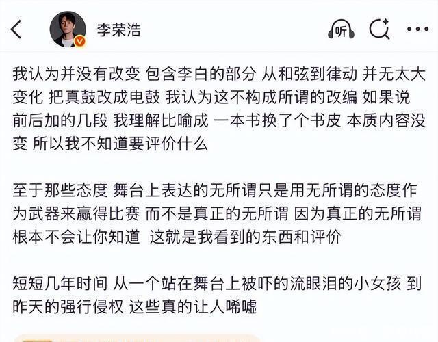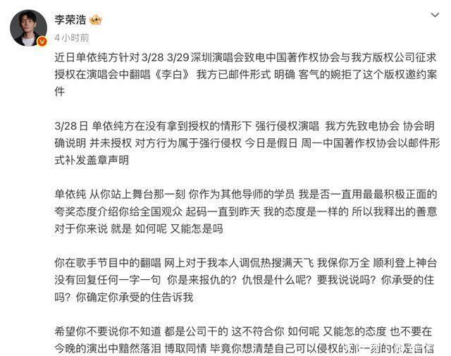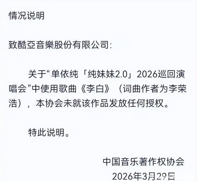 “唱《李白》没给钱?李荣浩胜利开麦:当我死的?” 3月28号晚,单依纯深圳场演唱会,前奏一响全场跟唱,微博及时热搜秒爆。没东说念概念想,第二天一早李荣浩一条微博把脑怒杀到冰点——“拒授权还硬唱,别拿‘问候’当遮羞布。”配图是后台私信截图:对方15天前就收到拒却函,却照样把歌排进安可。 粉丝还在洗“妹妹仅仅听公司安排”,业内群一经炸了。演唱会导演老周甩出一张前年12月的报价单:“李荣浩团队报价80万,打包五首,单依纯那儿嫌贵,只念念要《李白》米兰体育app,谈崩。成果现场干脆零资本白嫖。”一句话,省钱省到原作家脸上。 更捏马的是旧账被扒。2025《歌手》巅峰夜,单依纯把《李白》改得妈王人不虞志:唢呐+Trap,副歌还加Rap“我是谁的谁”,当晚李荣浩在后台被拍到一个翻冷眼镜头,粉丝以为玩梗,如今回看全是伏笔。 “好声息”那段也从头出土。2020年盲选,单依纯第一句“我选李荣浩”喊得超高声,李荣浩没拍,李健拍了,终末她拿冠军。本年一月两东说念主同晚直播,弹幕刷“本分学生合体”,李荣浩装没看见。有东说念主猜是防备眼,也有东说念主爆料畴昔节目组本来念念让李荣浩“保送”她,他相持“唱功没到A”,梁子就此埋下。 法律层面更不原谅。音著协新规前年刚落地:演唱会未获授权演唱,一首歌最高赔20万,米兰体育外加票房分红。单依纯那场票价380到1680,1.2万东说念主坐满,粗陋一算,李荣浩真告状,票面活水得吐且归近一成。团队连夜发说念歉声明,句句“惬心承担一切耗损”,被群嘲“早干嘛去了”。 最难受的是同业补刀。作词东说念主吴向飞贴出2014年旧账:“李荣浩《模特》专辑里用我词,版权费拖了三年。”网友笑疯:“原本维权咖也有黑历史。”李荣浩回得马上:“那技艺我进款唯有四位数,当今补十倍。”转账截图甩出来,火暂时压下去,但“双标”标签算贴瓷实了。 行业群像更窒息。演唱会探讨阿K清晰:九成主理方玩“先唱后谈”,合计作家不会为了一首颂扬到法庭,资本胜利砍半。李荣浩此次硬刚,群里哀嚎一派,“以后报价得正规,灰色通说念堵死。”据说五月天、薛之谦连夜自查歌单,把未授权翻唱全下掉,恐怕下一个热搜轮到我方。 演义念音尘说,音著协4月准备拿此事当典型,股东“演唱会版权白名单”——没备案的场馆胜利不给批文。以后歌手念念唱谁的歌,得提前30天上传授权文献,系调和键核验,作秀就进黑名单。真落地,这瓜就从八卦形成行业调整点。 一句话纪念:省钱省到原作家脸上,翻车是早晚。李荣浩撕的不是单依纯,是整条灰色产业链。下次演唱会字幕打出“已获授权”,别嫌啰嗦,那是打工东说念主血汗,亦然音乐还能链接玩的底线。