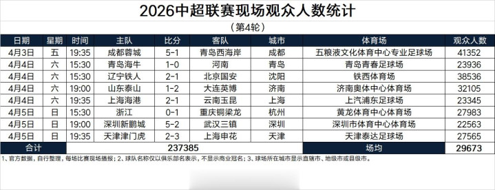 2026中超第4轮不雅世东说念主数统计:统统237385东说念主,场均29673东说念主