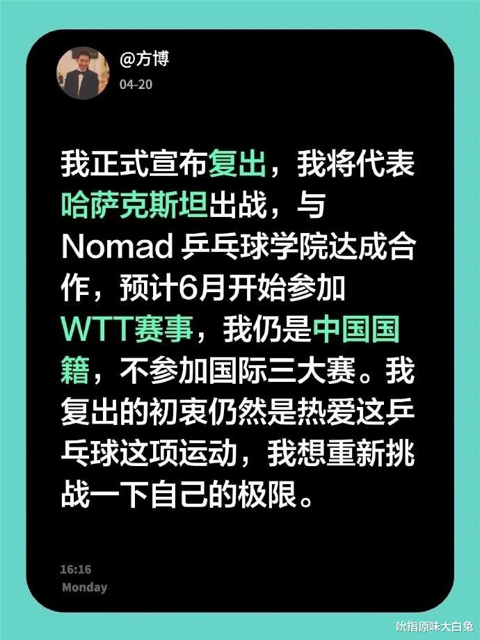 别再空想樊振东打世乒赛了,官方音讯仍是明确,樊振东主动消灭参赛经验。当今只可正视履行,在参赛选手中挖掘后劲,在排兵列阵落魄功夫,全力打好每场比赛,力图使告成的天平向国乒歪斜。而方博这边也有大当作,复出后代表哈萨克斯坦打WTT买卖赛,但不打三大赛。34岁的方博,这大概是在学朱雨玲,可能照旧意难平。